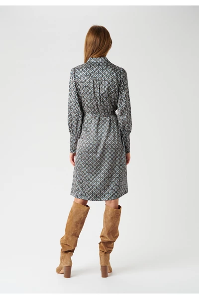 De jurk heeft een klassieke shirtkraag en een knopafsluiting langs de voorkant. Het heeft lange volumineuze ballonmouwen die zijn verzameld bij de pols met manchetten met een knopafsluiting. De jurk heeft verschillende kleine plooien die breedte aan de jurk toevoegen, in de taille is er een riem die kan worden gebruikt om de taille te verbeteren, maar de jurk kan ook zonder de riem worden gedragen. De jurk is knielengte.