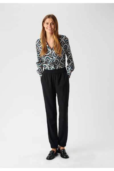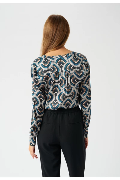 De blouse heeft een kleine kraag en een verborgen placket aan de voorkant met een verborgen knopafsluiting. De blouse is verzameld langs de halslijn, die een kleine breedte aan de blouse toevoegt. De kleine plooien aan de voor- en achterkant geven de blouse een semi -losse pasvorm. Het heeft lange mouwen met een manchet en knoopsluiting.