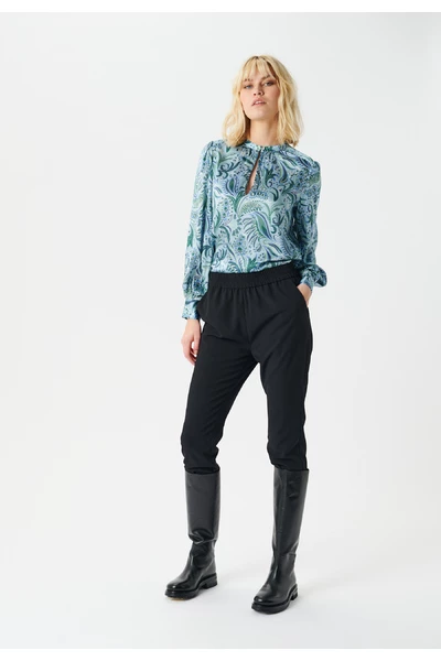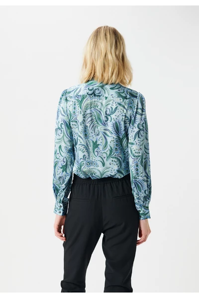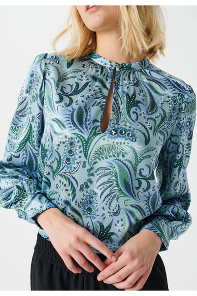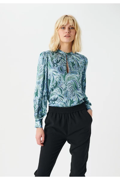 De blouse heeft een kleine kraag met een enkele knopsluiting en een sleutelgat aan de voorkant. Het heeft lange mouwen met verschillende kleine plooien op de schouder, die helpt om een scherpe uitstraling te creëren. De mouw is lang en volumineus en de mouw is verzameld in de pols bij de manchet met een knopafsluiting. De blouse is gemaakt in een semi -losse pasvorm op het lichaam.