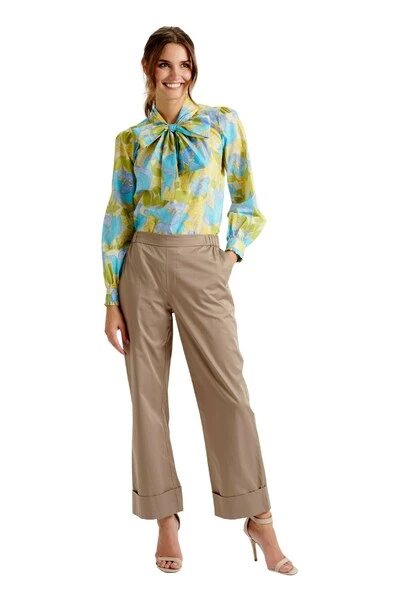 Shirt met strik, pofmouwen en ruches aan de manchetten.