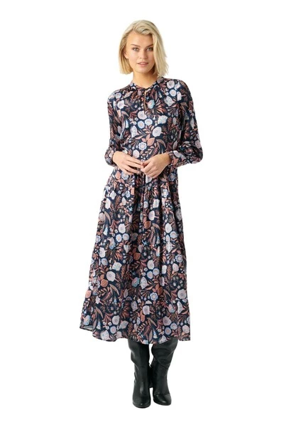 Jurk van Dea Kudibal. Dit model is voorzien van ballonmouwen, bloemenprint en traanvormige opening aan de voorkant.