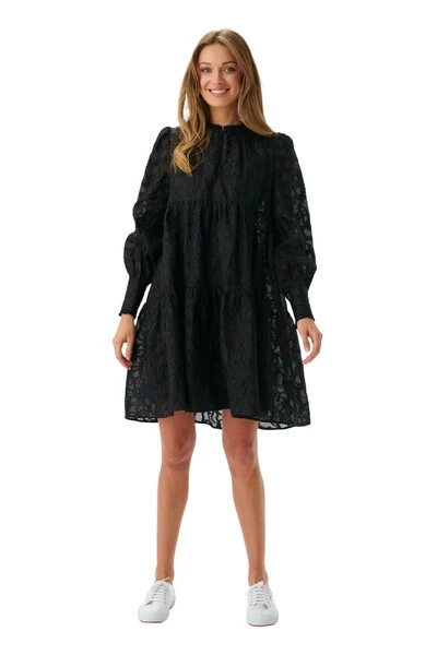 Mini -jurk met ballonmouwen en ruches bij kraag en manchetten. Niet -stretch stof