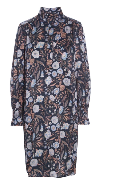 De jurk heeft een stand-up kraag en een knopafsluiting aan de voorkant. Het heeft lange losse mouwen die zijn verzameld door een smokkanchet. De jurk wordt over de schouders gemonteerd, maar wordt anders in een losse pasvorm op het lichaam gemaakt. Aan de achterkant zijn er verschillende kleine plooien waar extra breedte is toegevoegd, waardoor de jurk een losser op het lichaam past. De jurk heeft een bovenste knielengte.