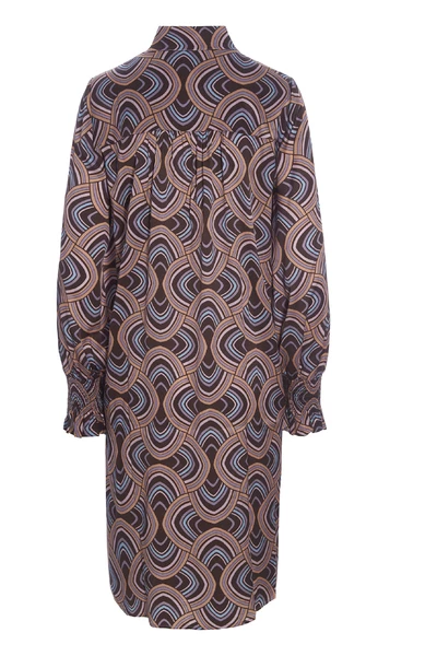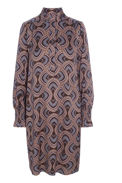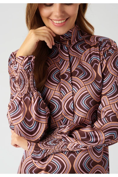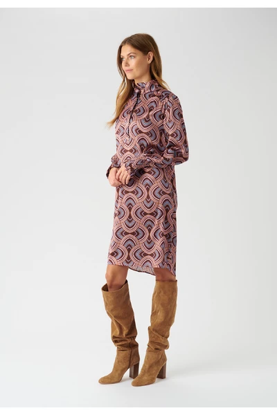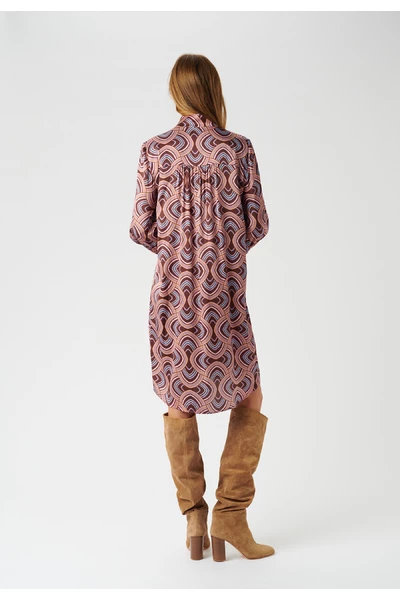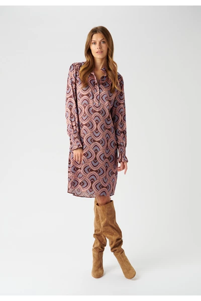 De Millia -jurk van Dea Kudibal is een prachtige jurk gemaakt in een prachtige zijden stretch -stof. De jurk is voorzien van de prachtige Elipse Peachy Print die is ontworpen door Dea Kudibal en een smokkanchet en een stand-up kraag met een knopafsluiting aan de voorkant.