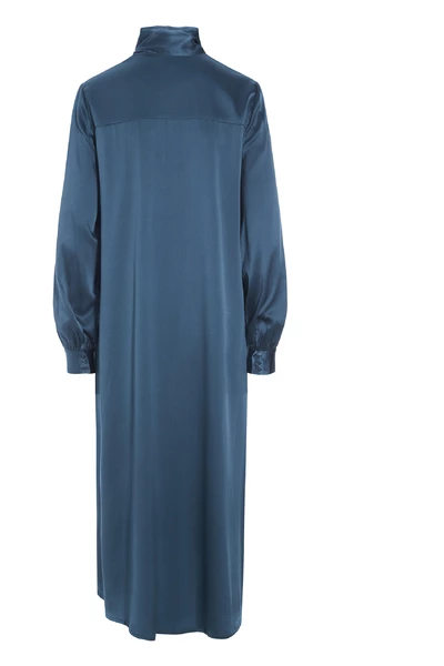 De jurk heeft een stand-up kraag en een boogdetail aan de voorkant. Het lint dat deel uitmaakt van de kraag kan op veel verschillende manieren worden gebonden, afhankelijk van de gewenste look. De jurk heeft lange losse mouwen die zijn verzameld bij de pols door een manchet met een knopafsluiting. De jurk is gemaakt in een losse flowy fit op het lichaam die zowel elegant is, maar de jurk ook een ontspannen gevoel geeft. De jurk is korter aan de voorkant dan achterkant en heeft een onder de knielengte.