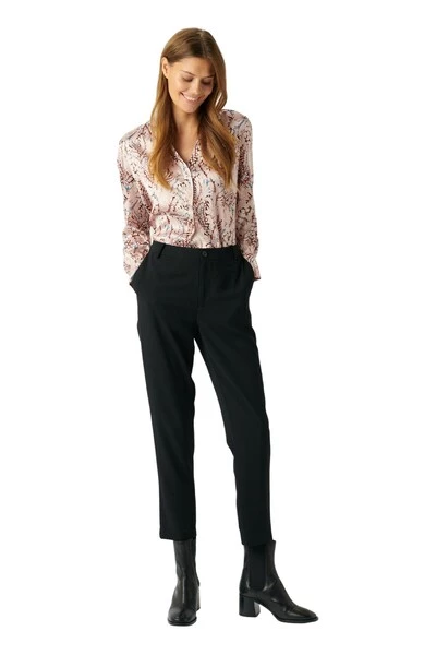 Blouse van Dea Kudibal. Dit model heeft een halslijn bevestigd met twee knopen, een patroon op het gehele oppervlak.