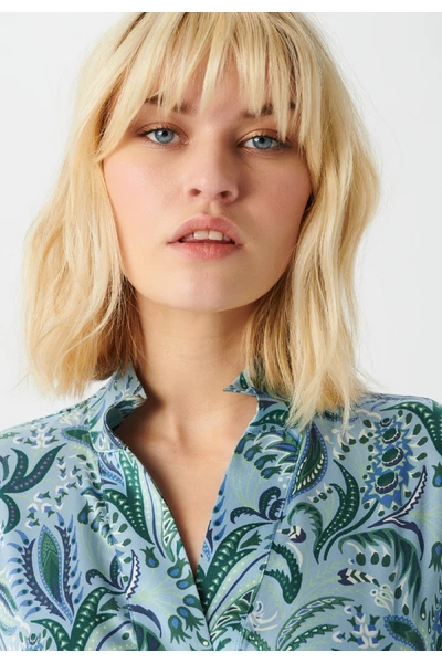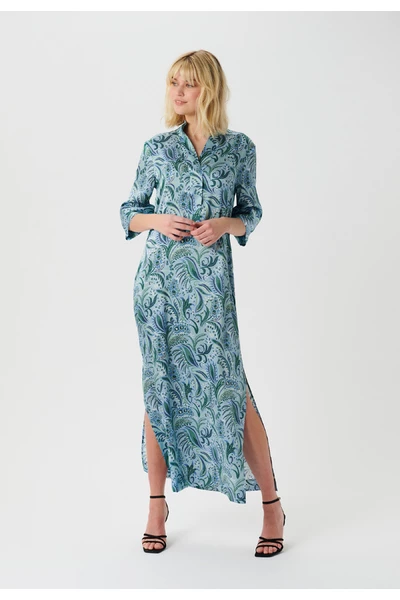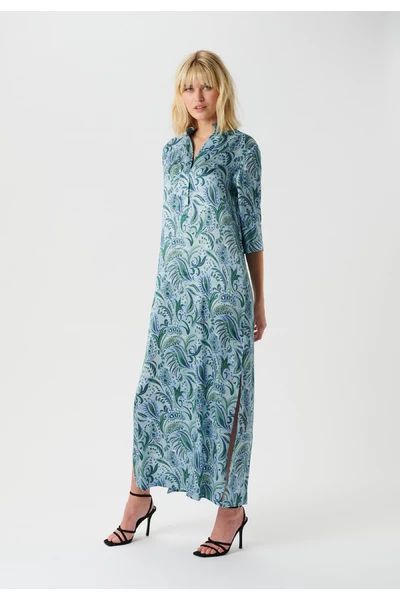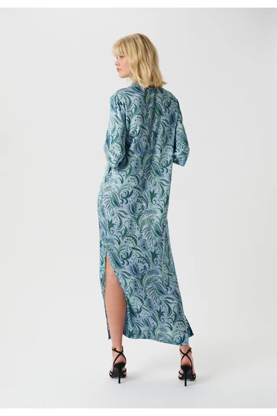 De jurk heeft een stand-up kraag die in een V-neckline aan de voorkant gaat, met een placket en verborgen knopafsluiting. Het heeft een wijd onder de ellebooghuls met een brede manchet. Er is een enkele grote plooi aan de voorkant die een beetje breedte toevoegt aan de jurk aan de voorkant, anders is de jurk gemaakt in een losse rechte snit op het lichaam. Er zijn twee spleten aan weerszijden die een beetje lichtheid toevoegen. De jurk is een enkellengte.