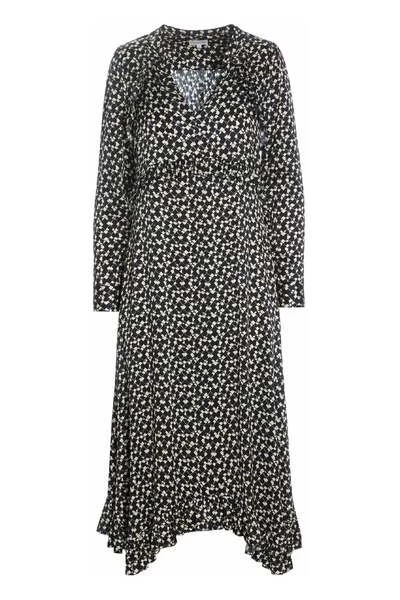 MIDI -jurk met assymetrische onderrand en flomedetails. Assymmetrische bodem zoom